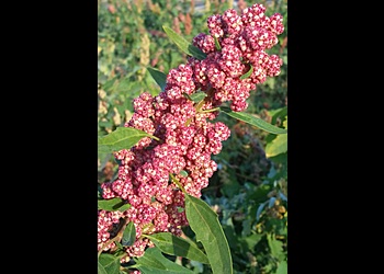 安定した収量と明るいピンク色の種子穂を作るキヌア。Frank Mortonによって南米品種から最初に育種された品種。